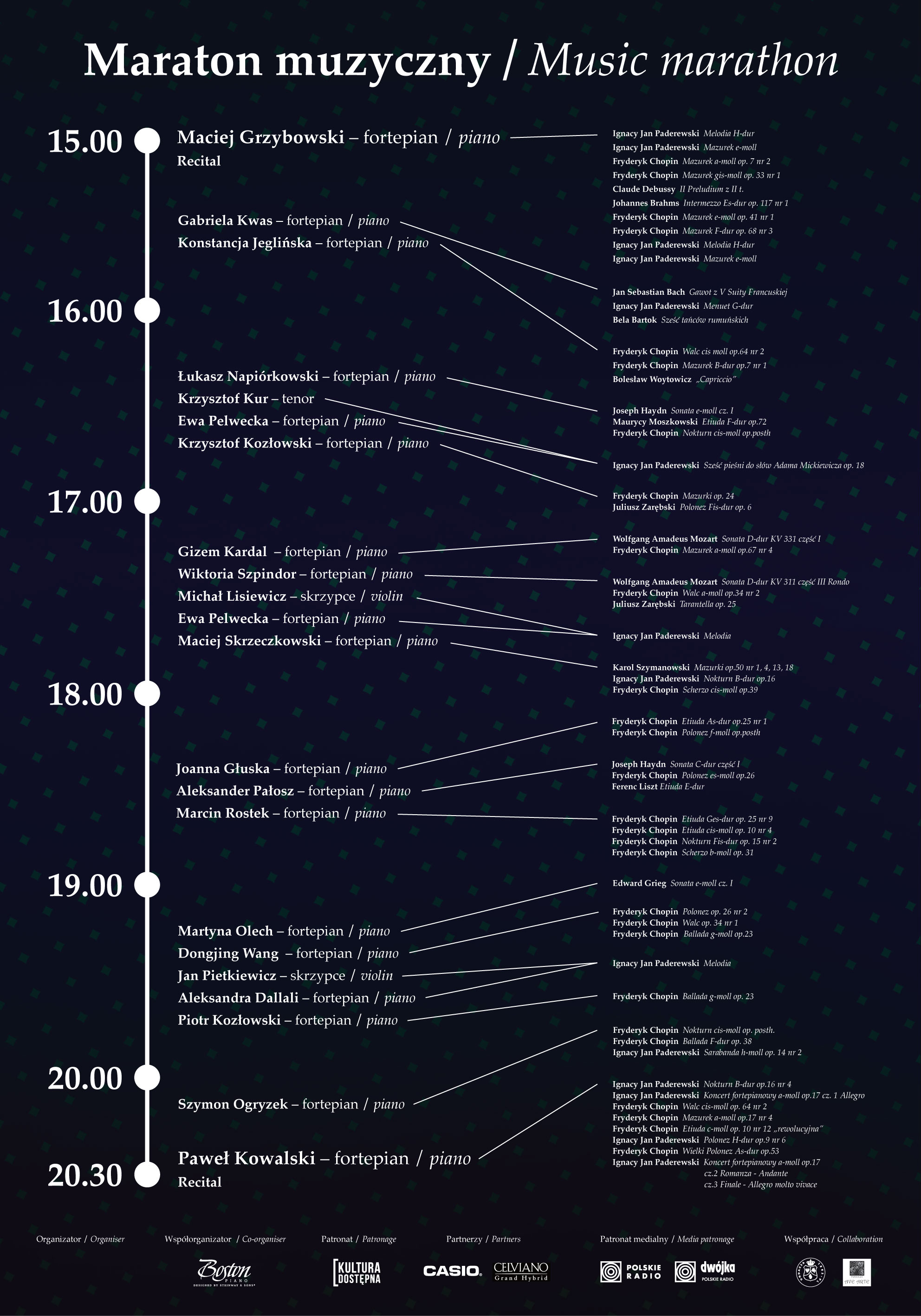 15.45 – 20.30 maraton muzyczny Wystąpi kilkunastu muzyków, w tym uczniowie warszawskich muzycznych szkół średnich oraz studenci i absolwenci Uniwersytetu Muzycznego im. Fryderyka Chopina w Warszawie.