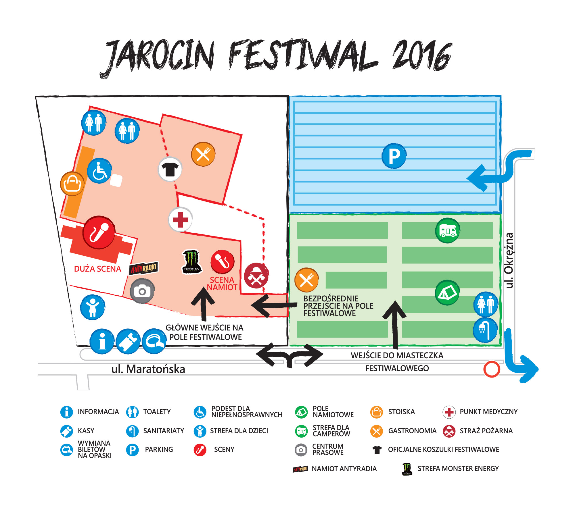 Główne wejście na pole festiwalowe zlokalizowane będzie przy ulicy Maratońskiej. Teren wydarzenia będzie pozostawał do dyspozycji uczestników na pół godziny przed pierwszą imprezą każdego dnia, zamykany będzie pół godziny po ostatnim koncercie.