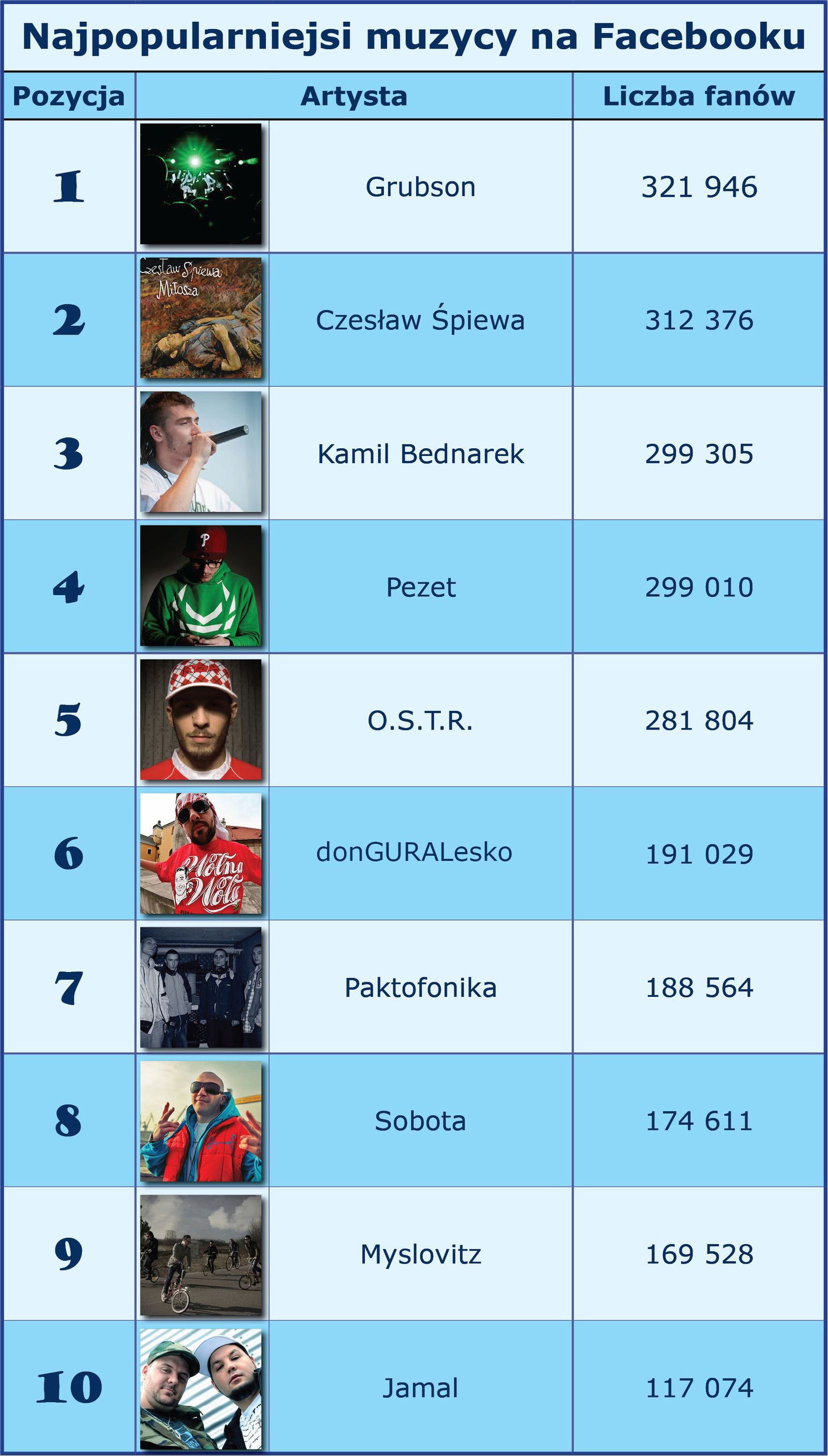 Co zaskakuje? Obecność sześciu raperów, dwóch artystów reggae, zespołu rockowego oraz wykonawcy muzyki alternatywnej. Jeśli zliczyć wszystkie subskrypcje stron hip-hopowców, mamy ich aż ponad 1 150 000 (oczywiście, mając w pamięci, że artyści dzielą się wieloma wspólnymi fanami).