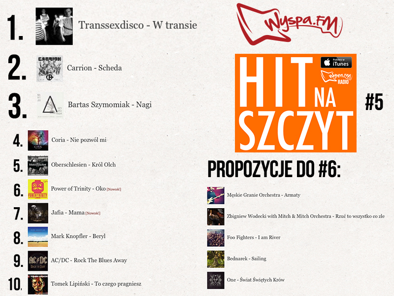 W tym tygodniu po raz kolejny zmiana lidera - w notowaniu #5 naszej listy HIT NA SZCZYT - na pierwszym miejscu podium ubiegłotygodniowa nowość - grupa Transsexdisco z utworem "W transie".
