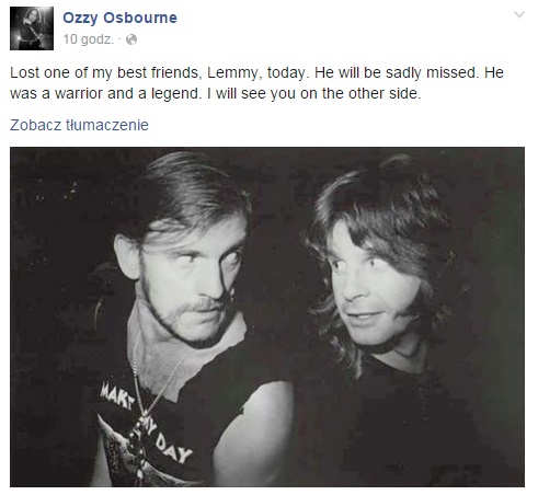 Ozzy napisał: "Dziś, straciłem jednego z najlepszych przyjaciół. Będę za nim tęsknił. Był wojownikiem i legendą. Widzimy się po drugiej stronie!" - Ozzy Osbourne
