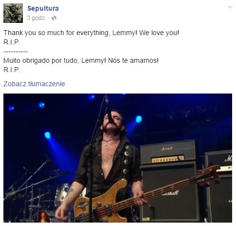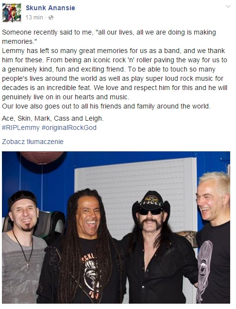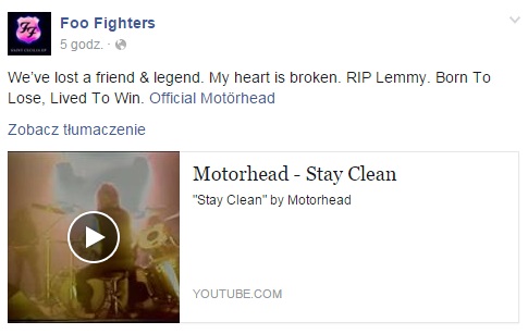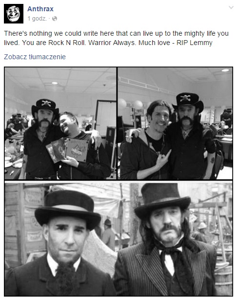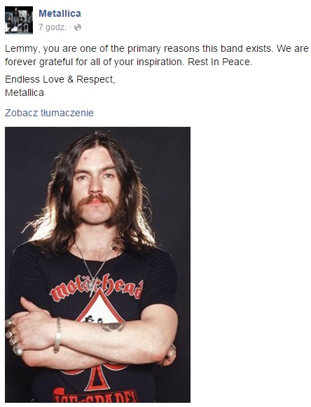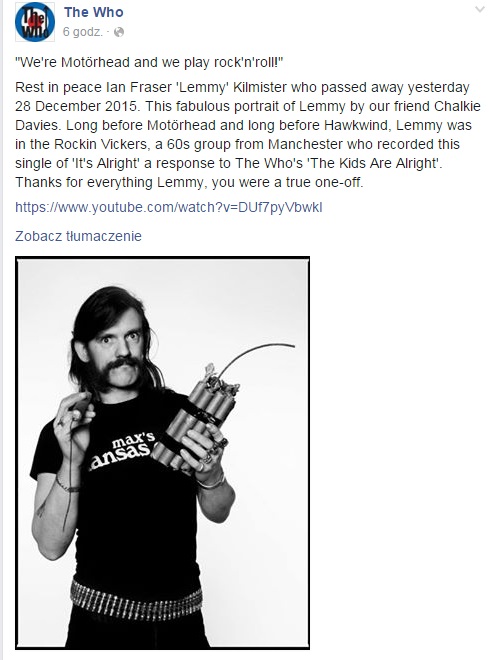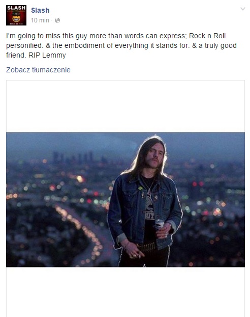 Tak świat muzyki wspomina zmarłego wczoraj w Los Angeles Lemmy Kilmistera z Motorhead. Na swoich portalach społecznościowych wspominają go między innymi: Ozzy Osbourne, Slash, King Diamond.