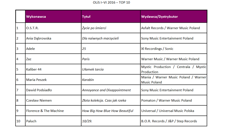 Znaczący udział polskiego repertuaru pokazuje także półroczne podsumowanie listy OLiS. W TOP 10 zestawienia siedem pozycji należy do polskich artystów, zaczynając od albumu O.S.T.R. Życie po śmierci, który znalazł się na 1. miescu, następnie na 2. Ania Dąbrowska – Dla naiwnych marzycieli, na miejscu 5. Kaliber 44 – Ułamek tarcia, na 6. Maria Peszek – Karabin, na 7. Dawid Podsiadło – Annoyance and Disappointment, na 8. Czesław Niemen – Złota kolekcja. Czas jak rzeka oraz na 10. Paluch i 10/29.